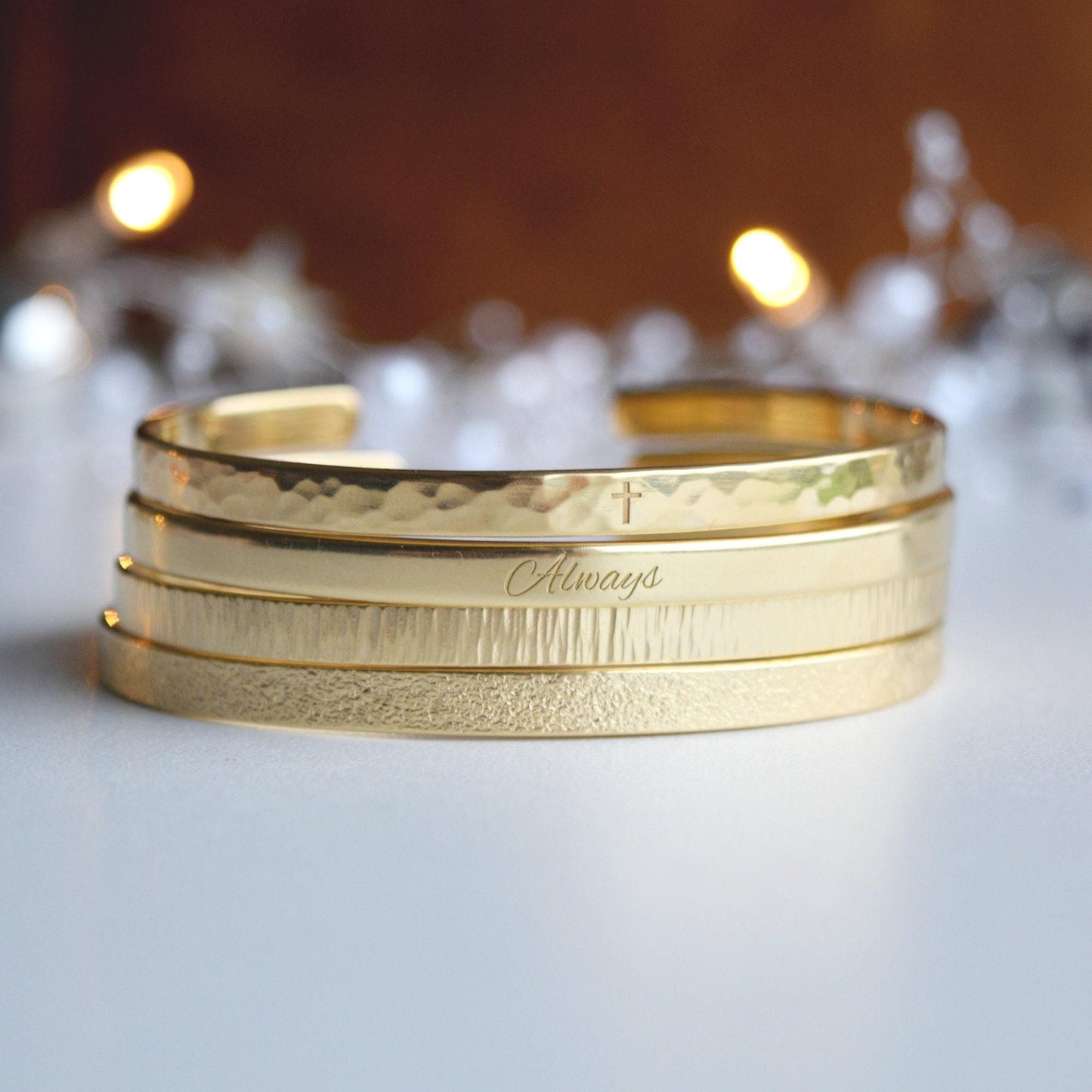 - The bracelets are available in both smooth and textured finishes