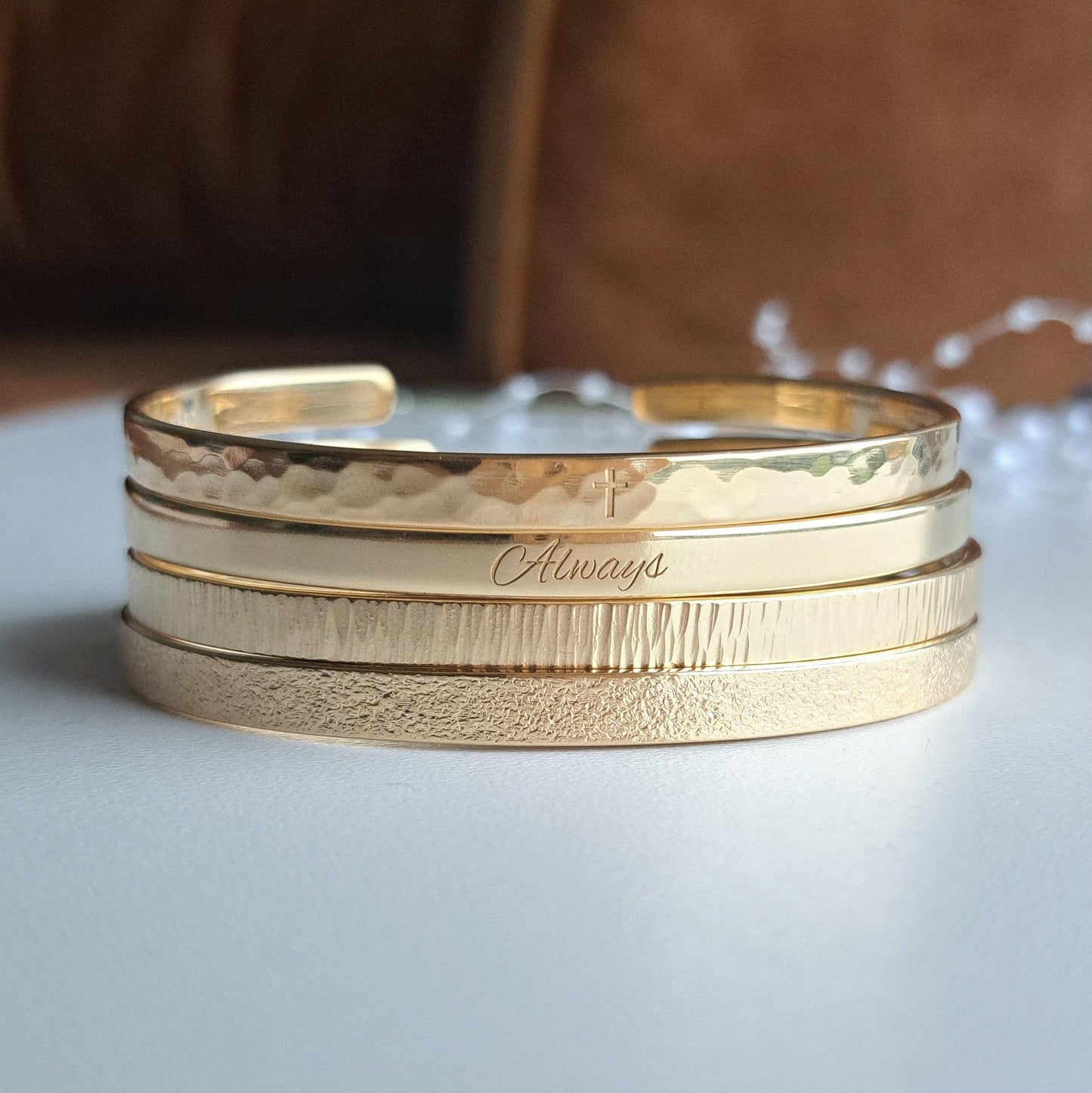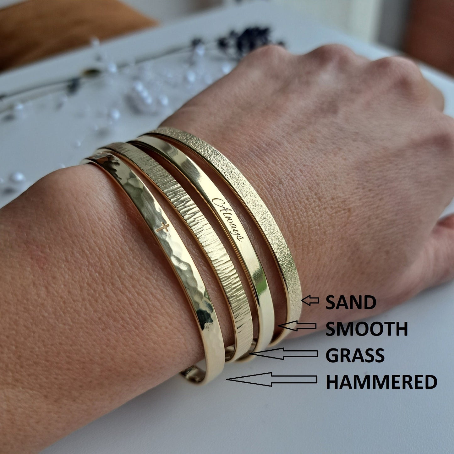 - The bracelets are available in both smooth and textured finishes