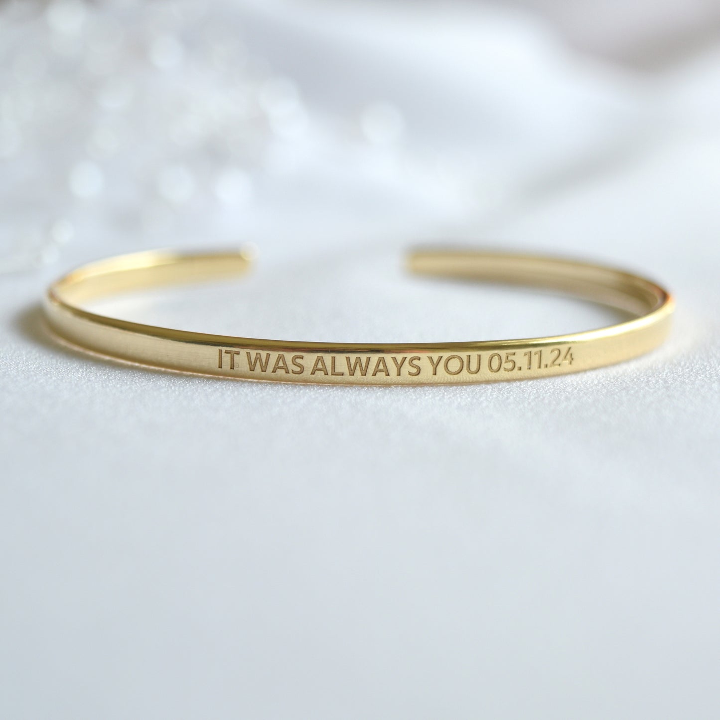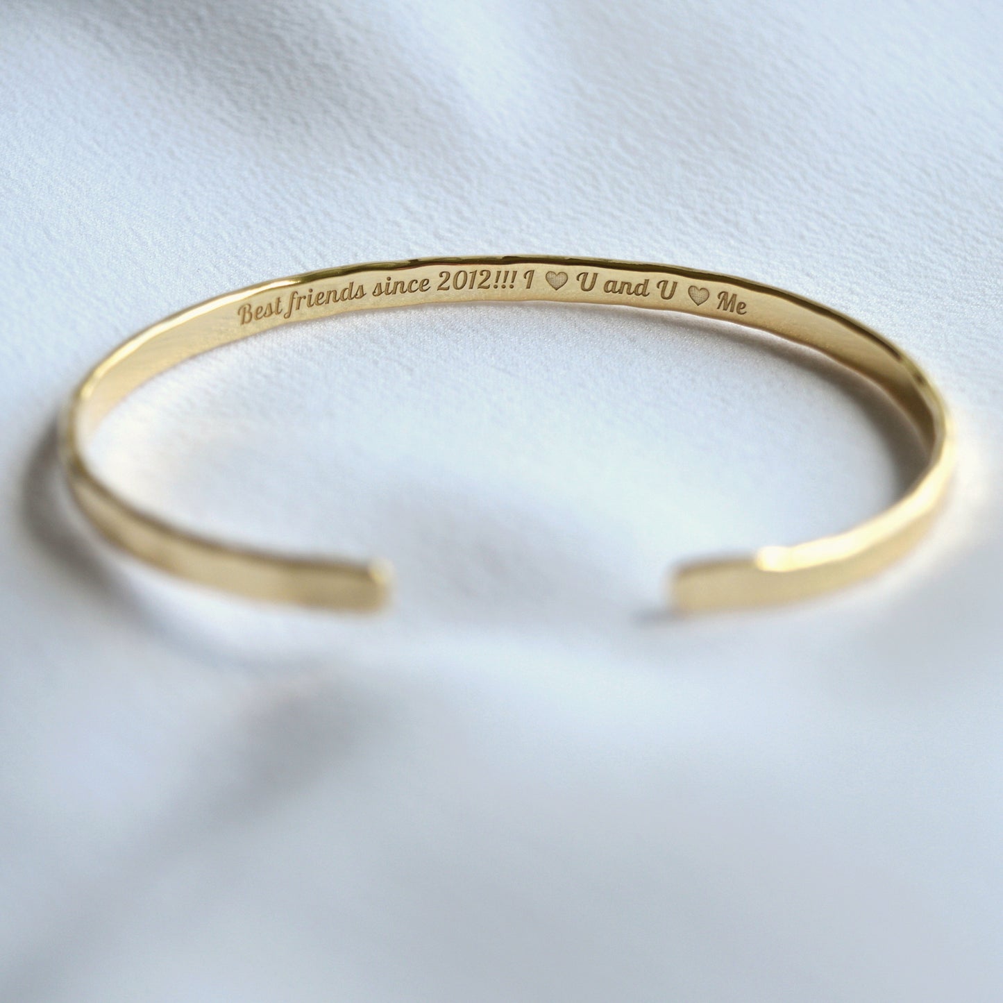 You can engrave any text, coordinates, numbers, symbols, dates outside or inside the cuff.