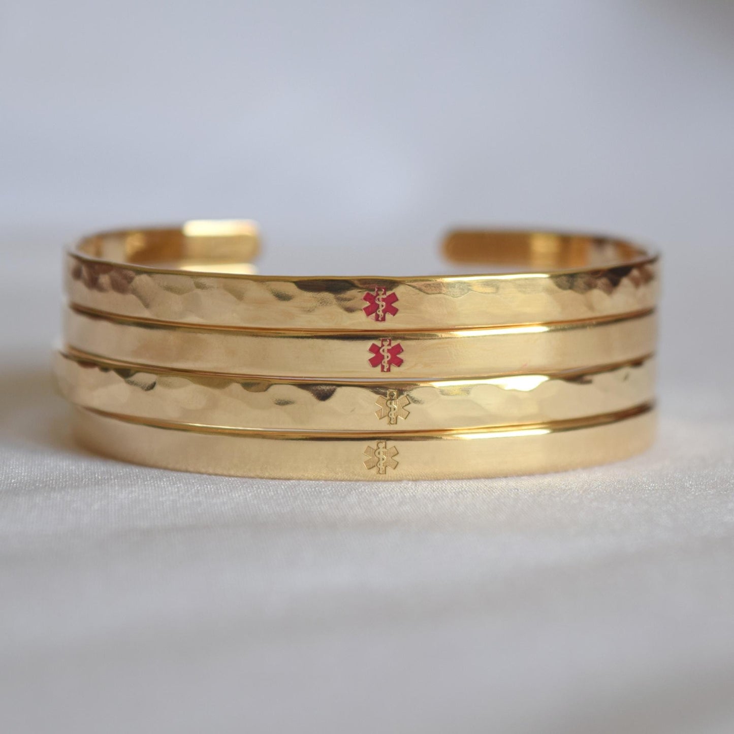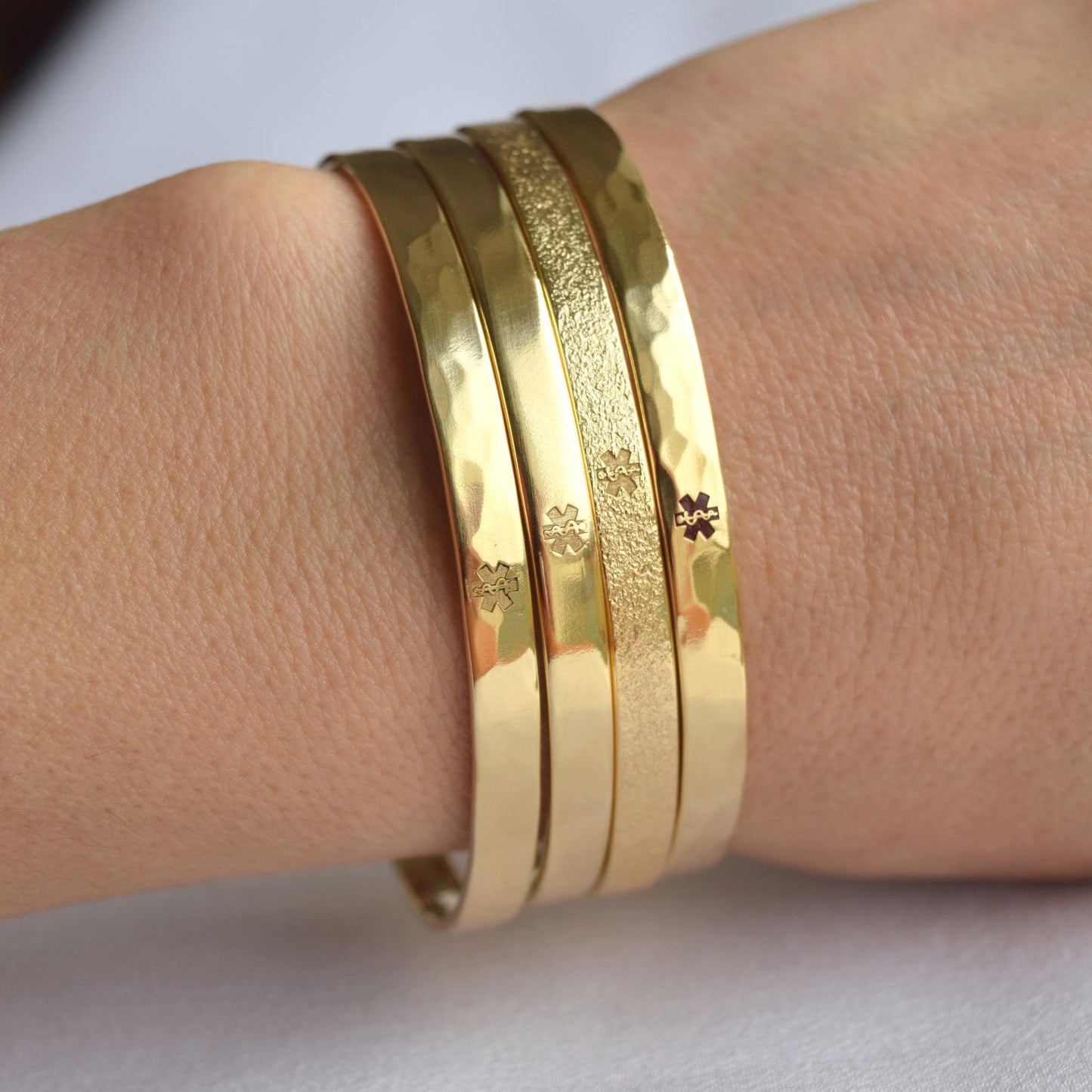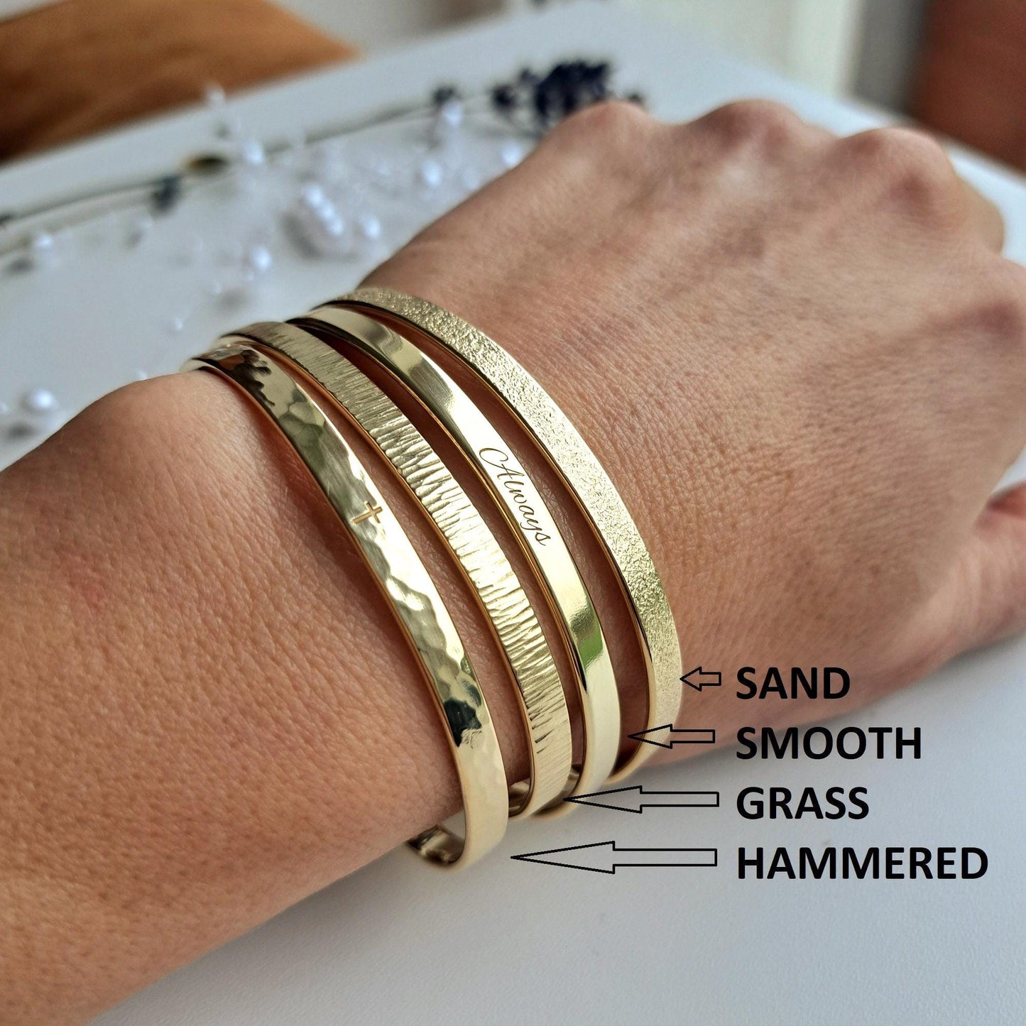 - The bracelets are available in both smooth and textured finishes