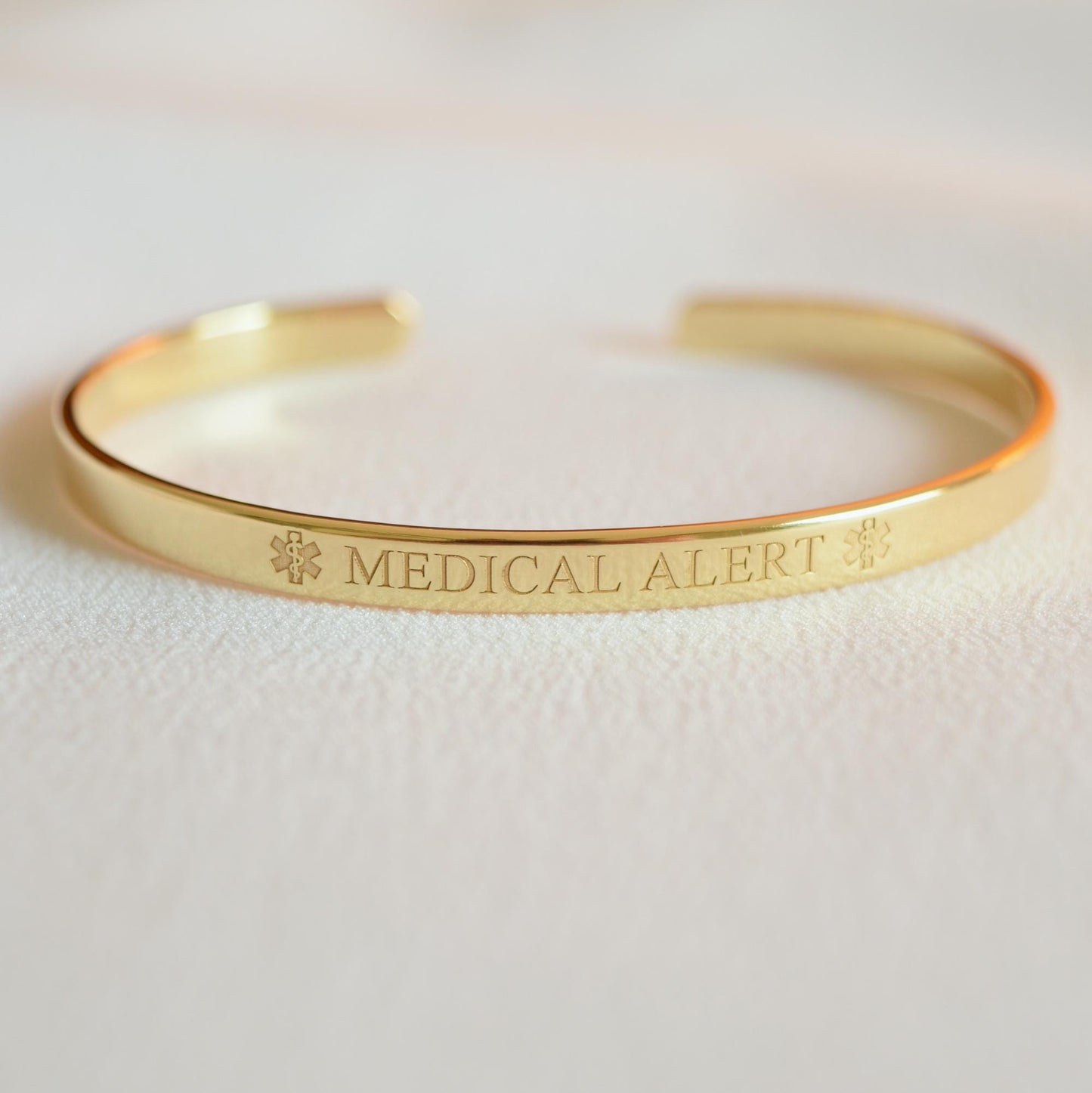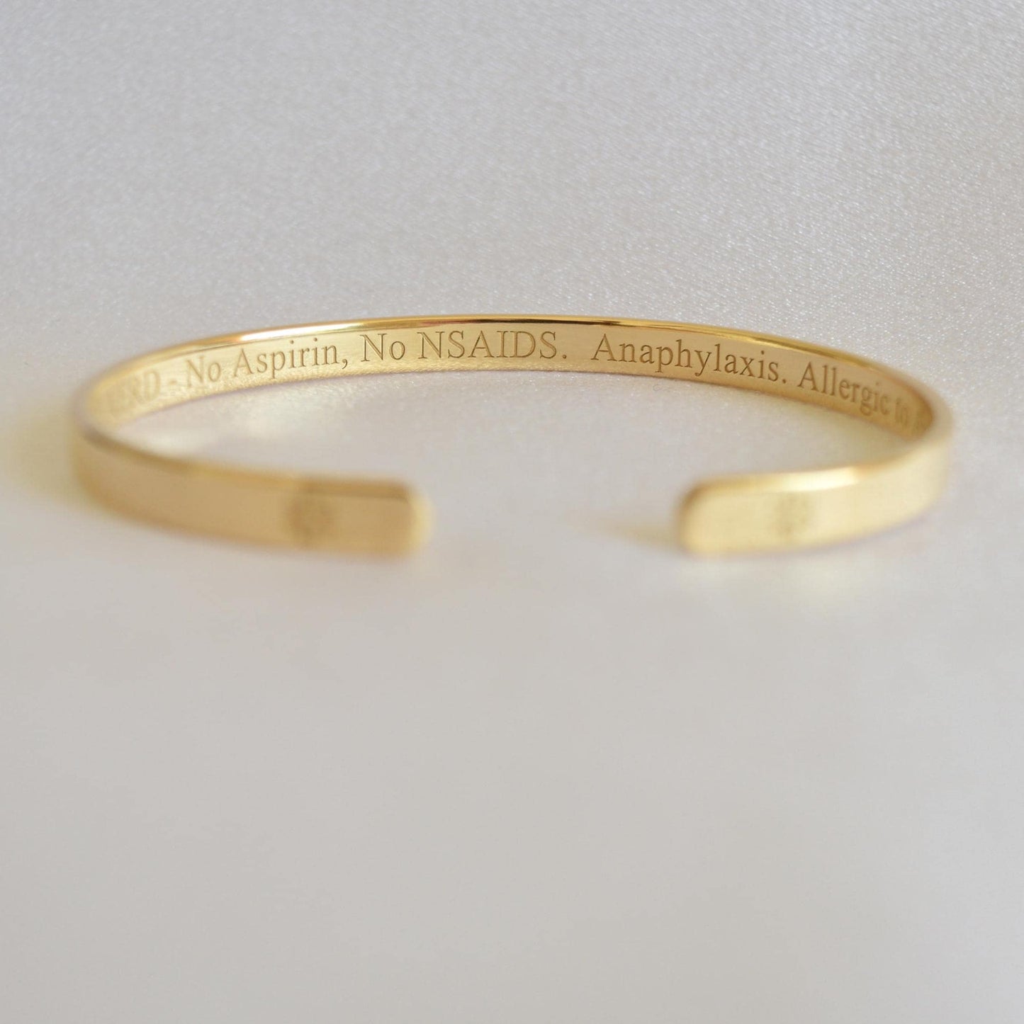 - 22K Gold plated bracelet engraved with your medical information: allergies, medical conditions, medications, implanted devices, or other relevant medical information