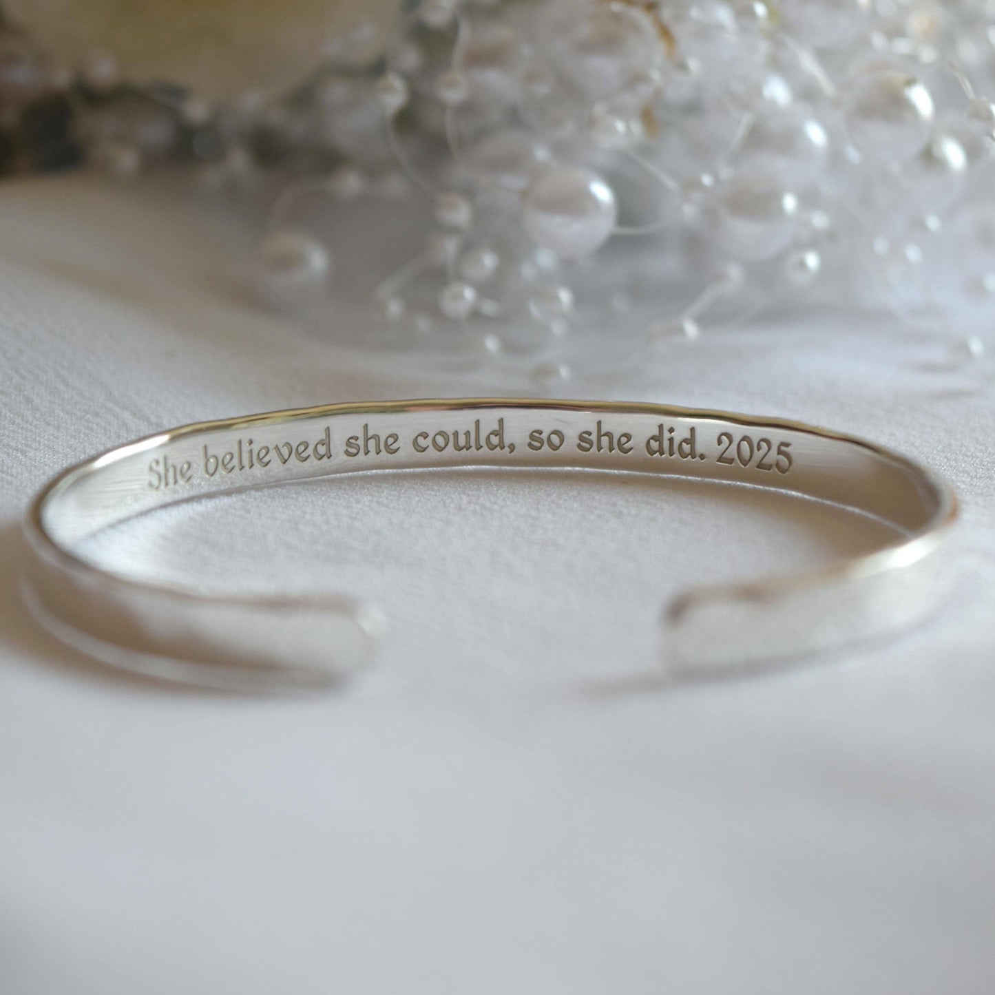 Engraved Sterling Silver Bracelet: Smooth or Textured, 5mm Wide, Graduation, She believed she could...
