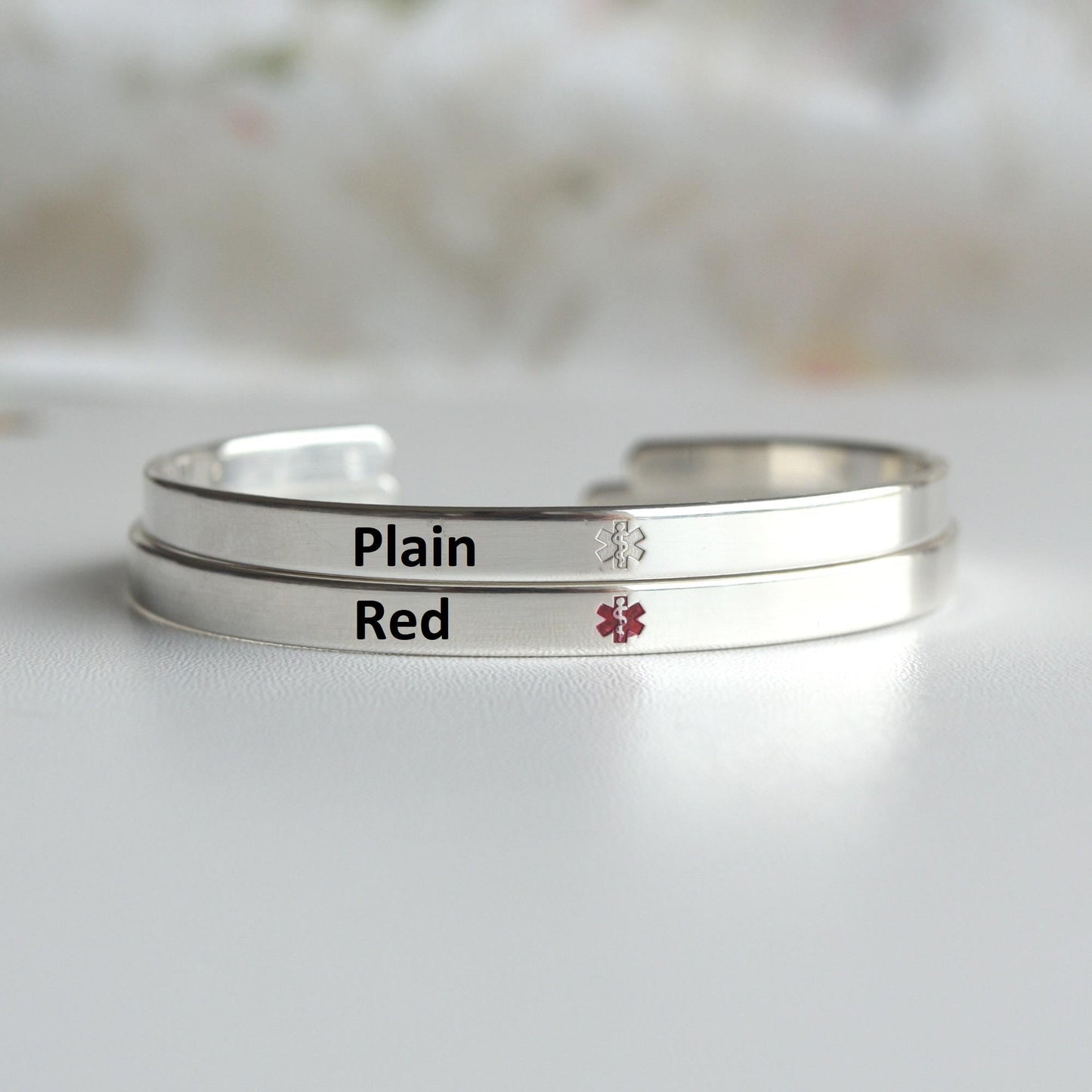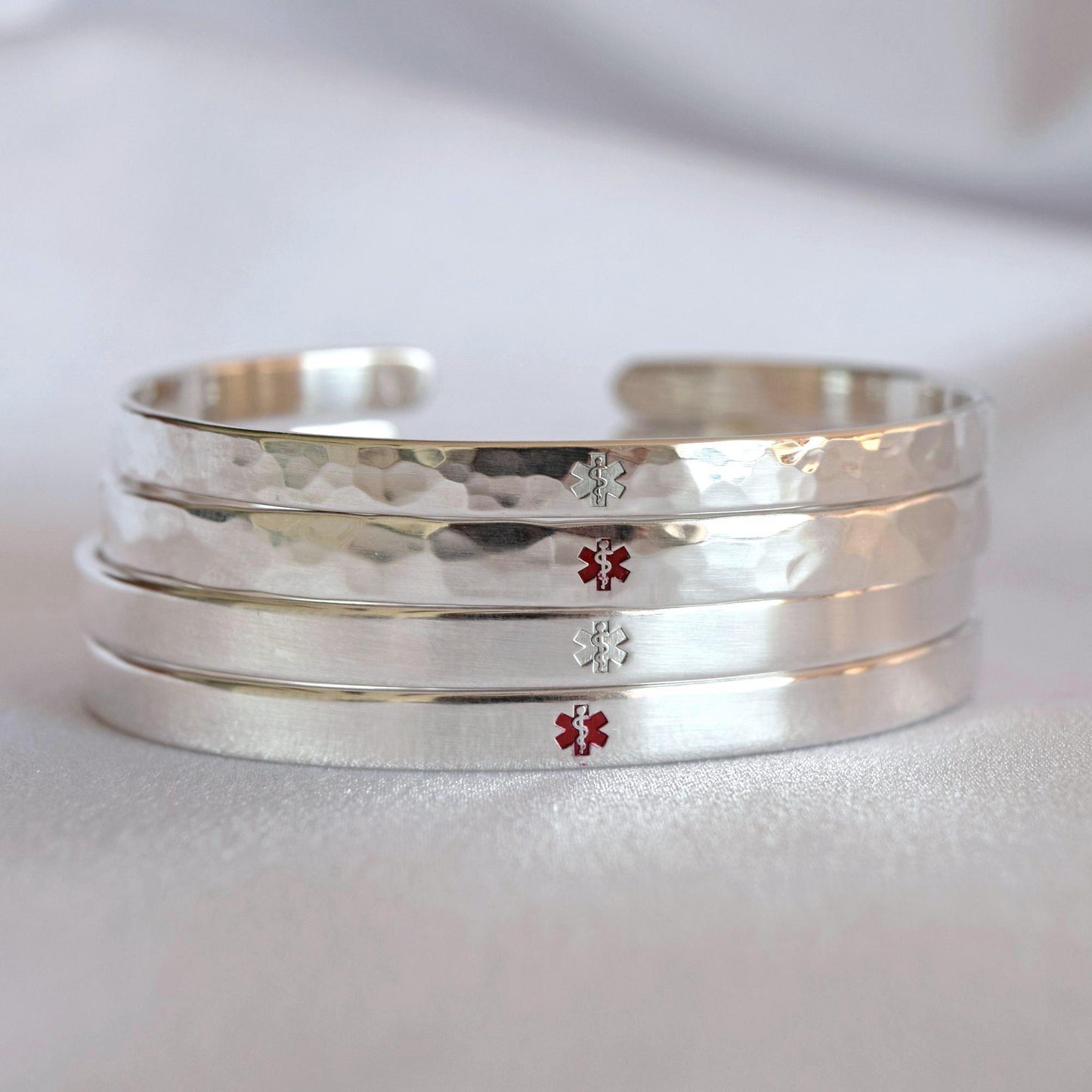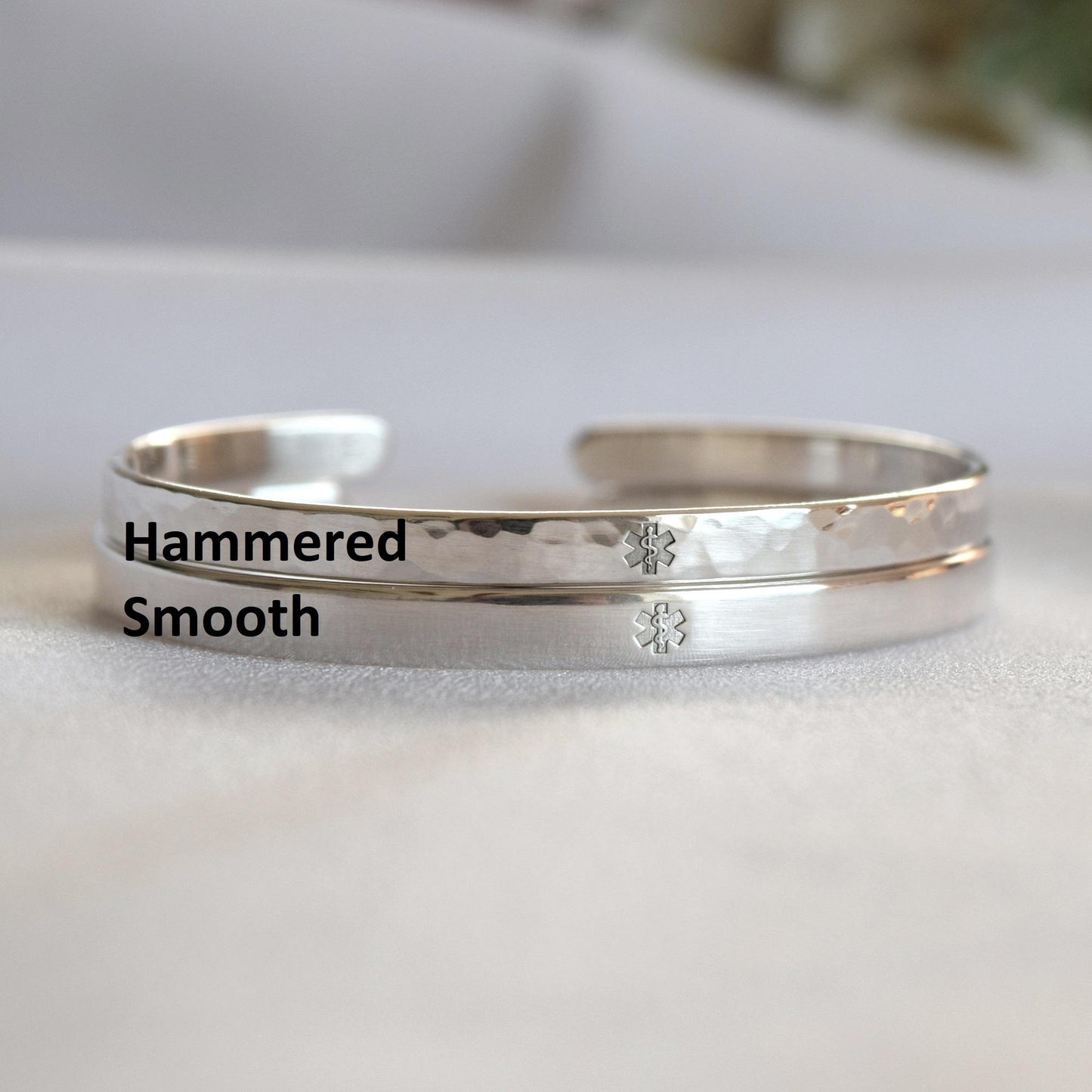 - Hammered or Smooth Sterling Silver cuff bracelet with Medical Alert Symbol outside